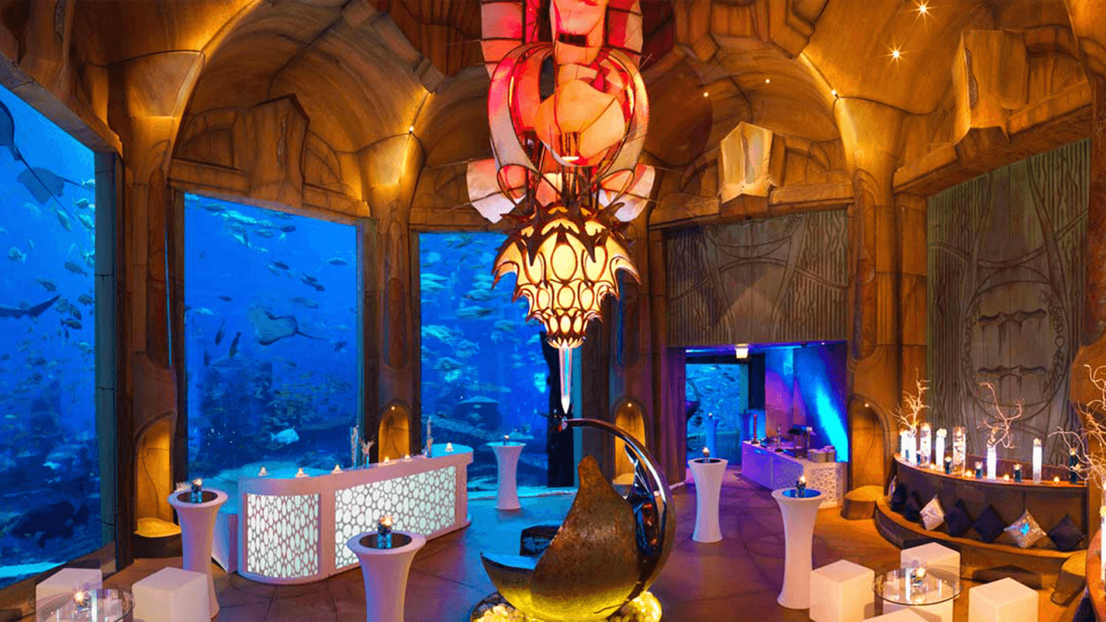 The resort's signature spaces break conventional boundaries. The Asateer Tent accommodates up to 2,500 guests with uninterrupted Dubai skyline views, blending luxury with traditional Arabian hospitality for fashion shows, conferences, and exhibitions. Palm Beach provides a stunning Dubai Marina backdrop for parties, gala dinners, and awards ceremonies. The Lost Chambers Aquarium creates show-stopping events surrounded by 65,000 marine animals for up to 150 guests; perfect for product launches and celebration events. Aquaventure World spans 17 hectares, ideal for grand team-building activities and vibrant parties.